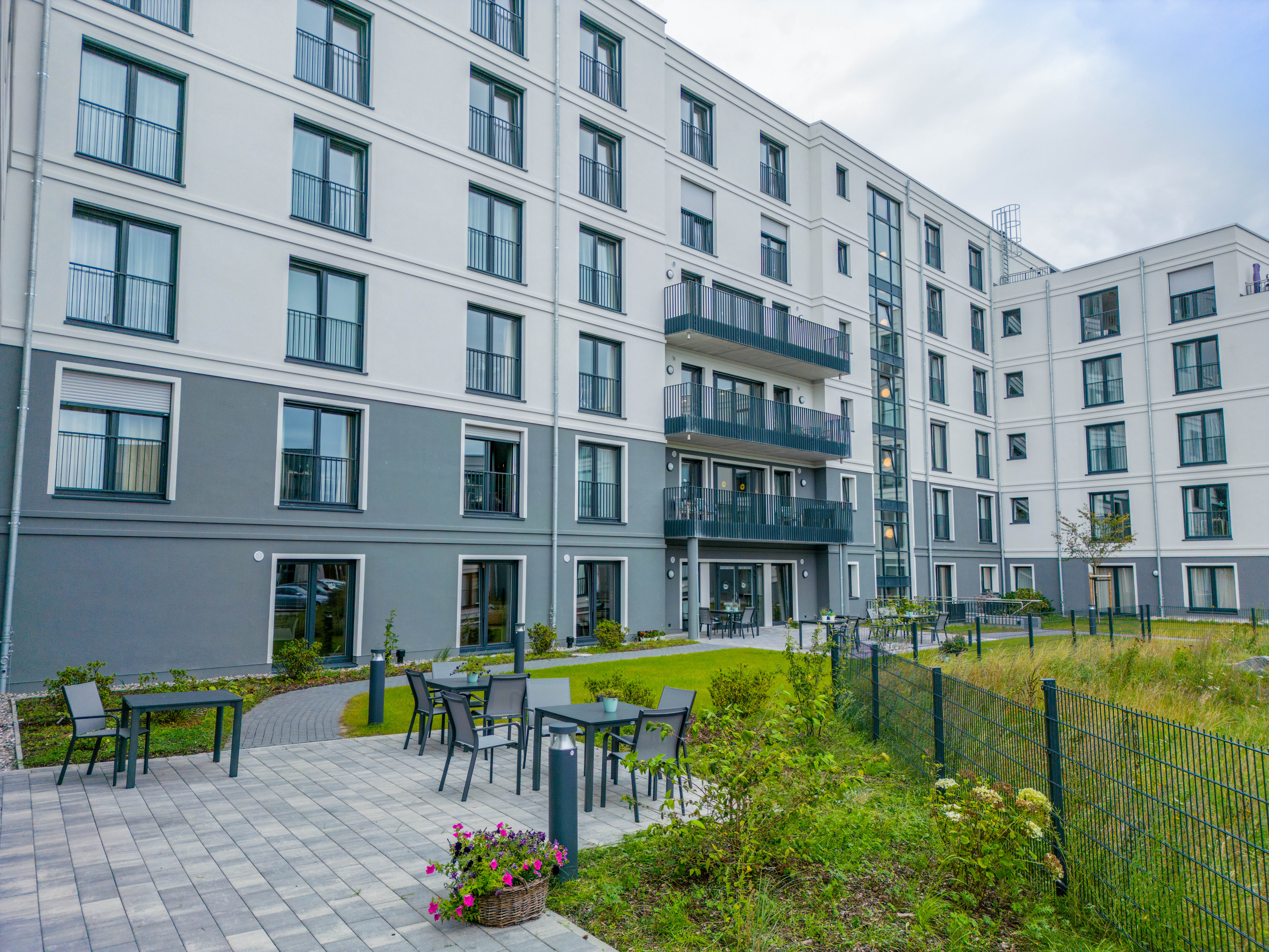 Unsere Betreuungs- und Pflegekräfte ermöglichen einen begleiteten Spaziergang im hauseigenen Garten. Im Außenbereich stehen Bänke zum Erholen zur Verfügung. Alle Fenster sind schallgeschützt und Terrassen und Bewohnerbalkone sind zum grünen ruhigen Innenhof ausgerichtet.